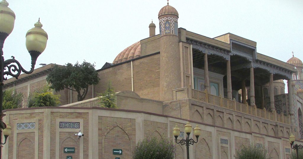 Фасад здания, как и его фундамент, выполнен в традиционном центральноазиатском стиле с использованием мозаики и геометрических узоров.