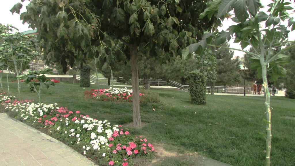 Напротив мечети симпатичный садик с деревьми и цветочными клумбами.