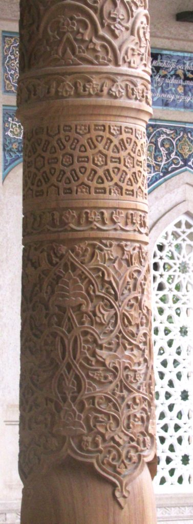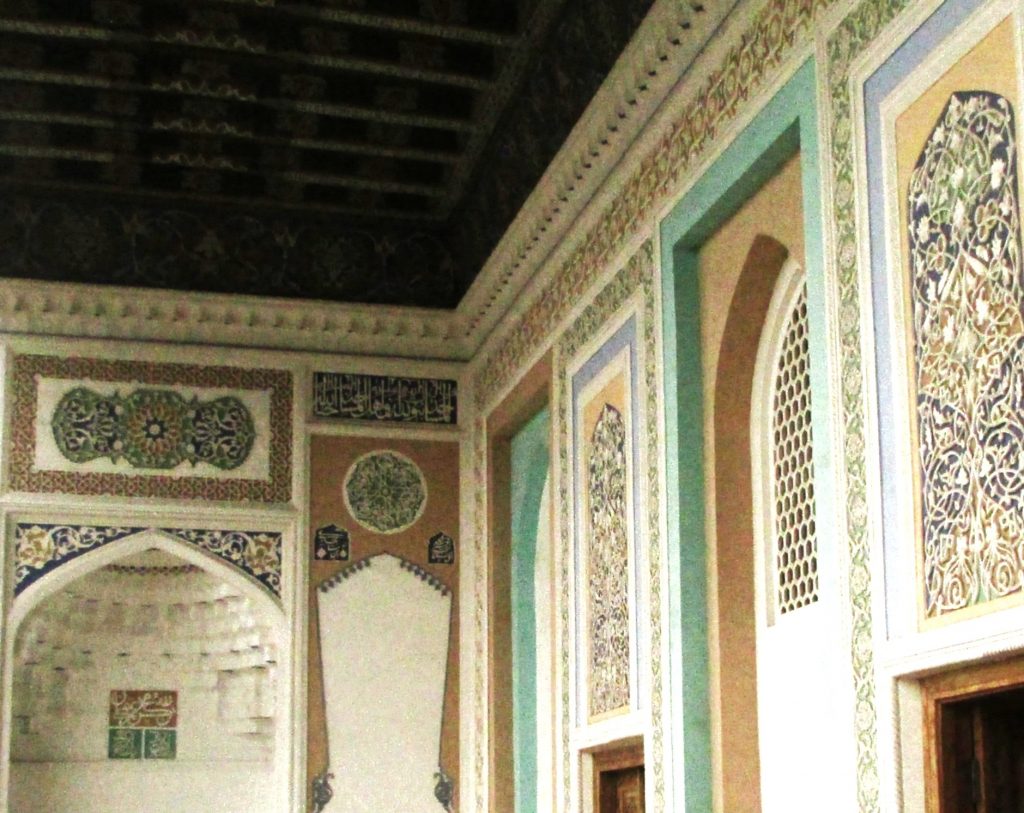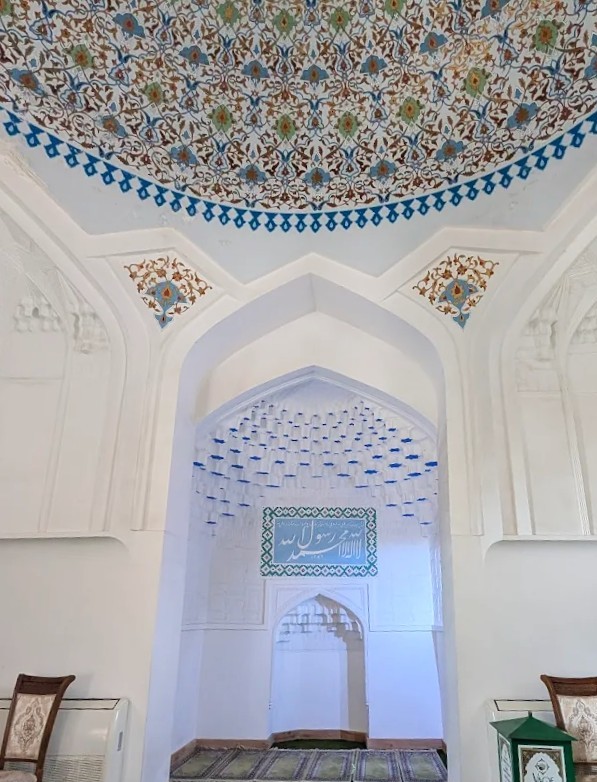 Стены мечети декорированы традиционной узбекской полихромной резьбой по ганчу.