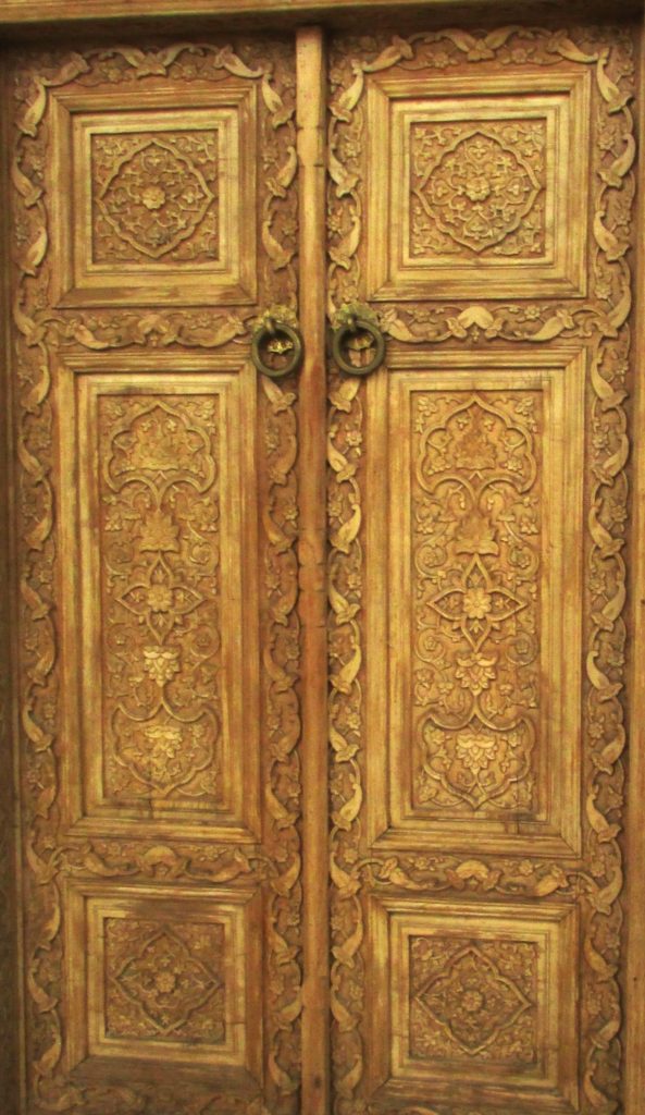 А это одна из дверей, украшенная сложной геометрической и арабесковой резьбой с дверными ручками в виде латунных колец.