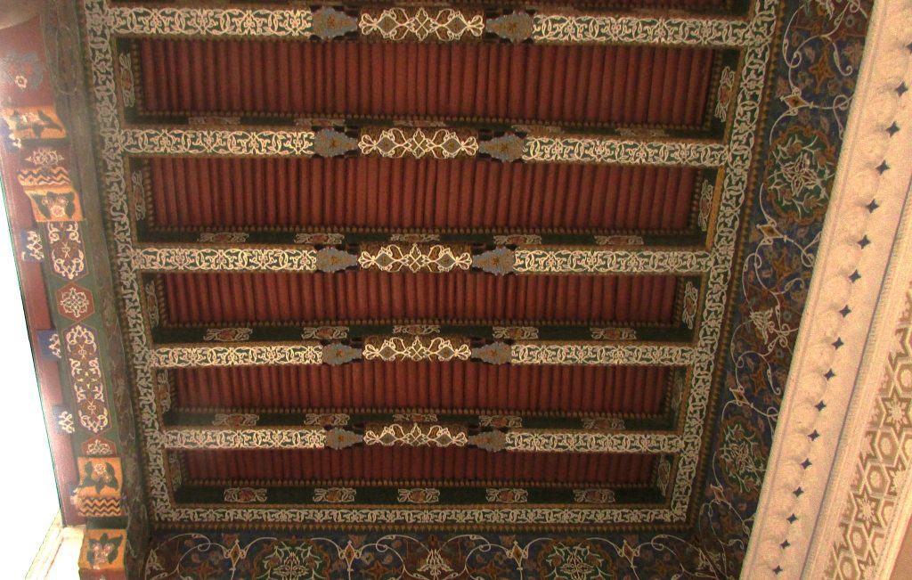 Над ним исключительно красивый потолок украшенный изысканной резьбой по дереву, а также замысловатыми геометрическими узорами из лепнины и плитки зеллидж. Яркий образец арабо-мусульманской архитектуры.