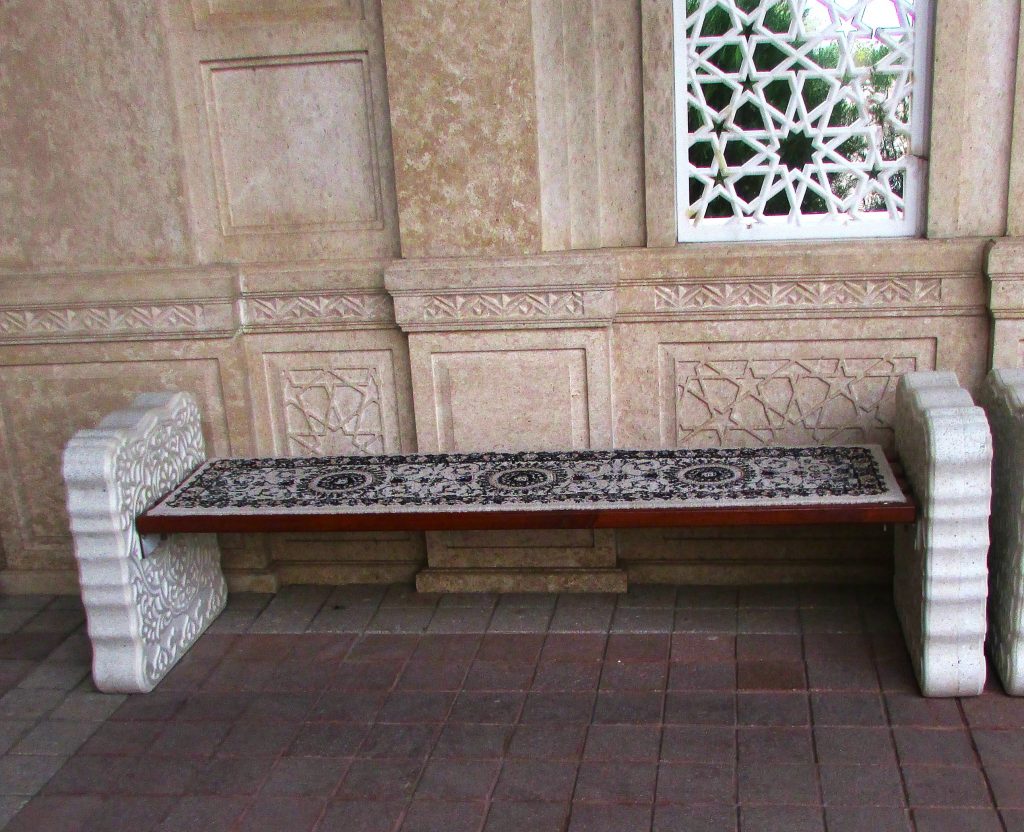Вдоль стен стоят красивые скамейки с декоративными элементами в в восточном стиле. Боковые опоры изготовлены из камня и украшены рельефным геометрическим орнаментом, характерным для марокканской или исламской архитектуры.